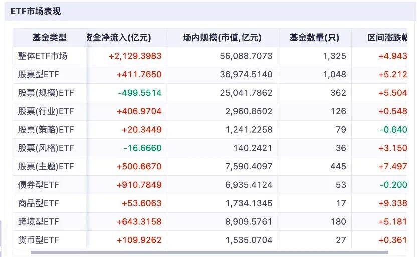 9月最后一个交易日,股债双牛,完美收官。整体ETF市场9月资金净流入2129.4亿元,场内ETF规模超5.6万亿元。资金在9月爱买什么?债券ETF、跨境ETF、股票ETF以及货币ETF均有不同程度净流入。