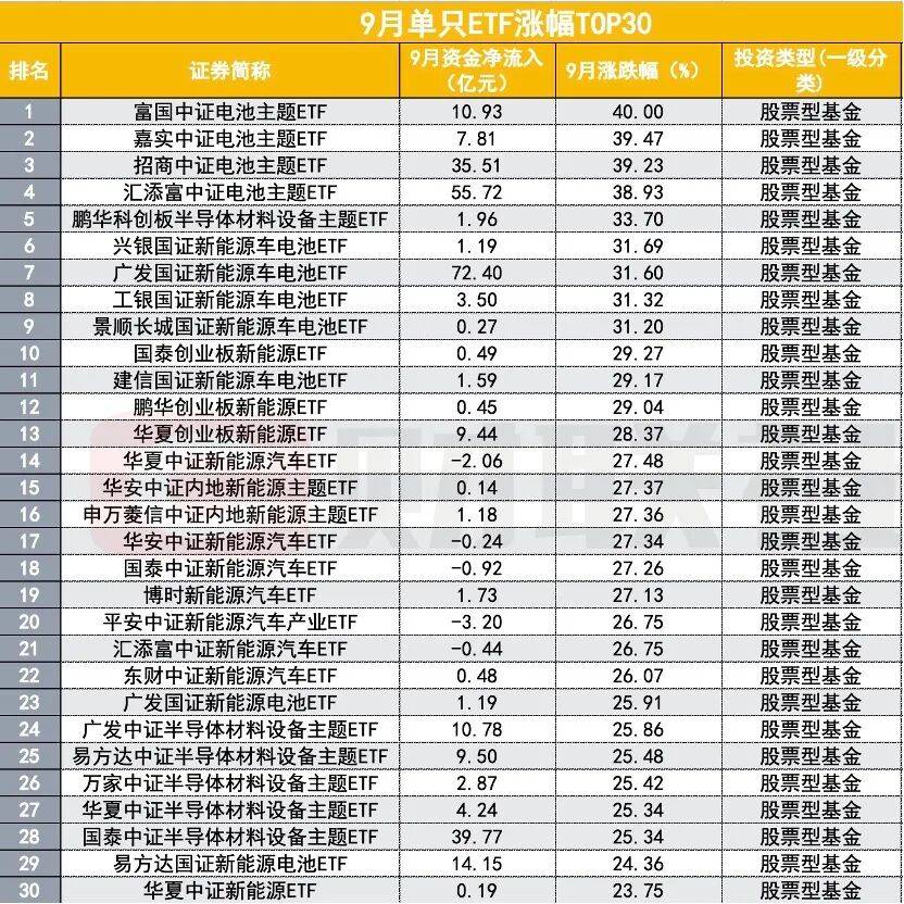 其中,富国中证电池主题ETF在9月涨幅最高,达40%,随后依次是嘉实、招商、汇添富等旗下中证电池主题ETF,鹏华科创板半导体材料设备主题ETF排名第五,9月涨幅33.7%。以电池、新能源为主的创业板与半导体材料带动下的科创板是9月市场最为吸睛的板块。