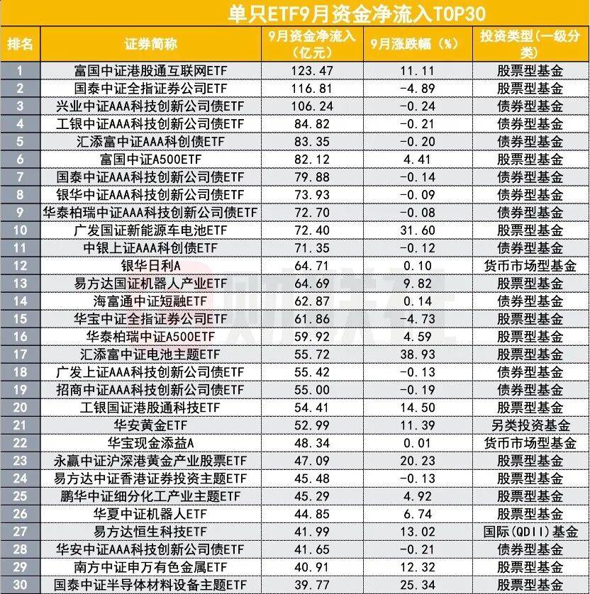 单只ETF最为吸金的莫过于富国中证港股通互联网ETF,该ETF在9月获得123.47亿元的资金净流入。单月吸金超百亿的还有国泰中证全指证券公司ETF、兴业科创债ETF,分别净流入116.81亿元、106.24亿元。