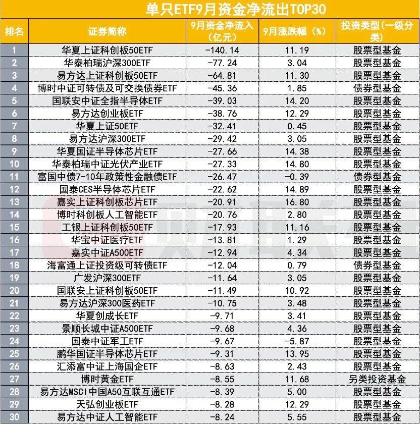 单只ETF资金净流出方面,华夏科创50ETF“受伤”最深,该ETF单月涨幅超11%,净值连创近年新高,随着净值上涨,投资者解套后陆续赎回,9月净流出140.14亿元;同样遭遇赎回较多的还有易方达科创50ETF,单月净流出64.81亿元。