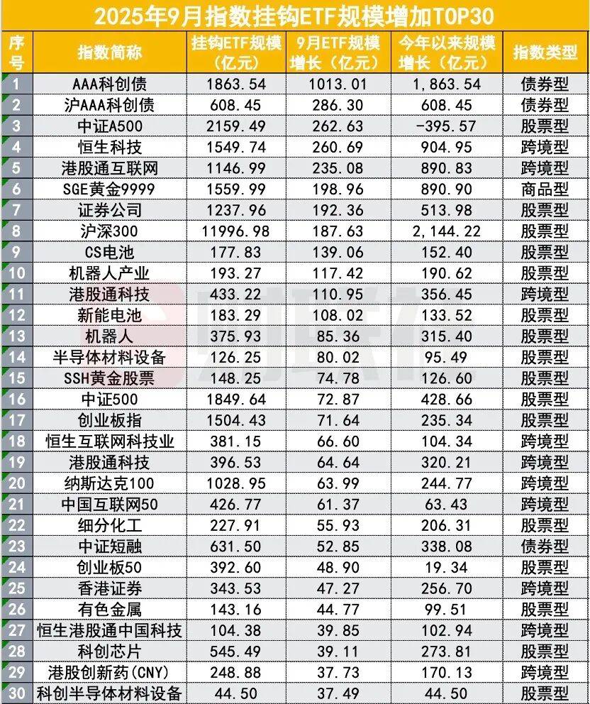 从指数角度来看,债券指数超过股票指数,科创债系列指数是最大赢家,挂钩AAA科创债指数和沪AAA科创债指数的ETF资金9月净流入占据第一、二名,两者合计净流入1299.31亿元,合计挂钩指数规模近2500亿元。