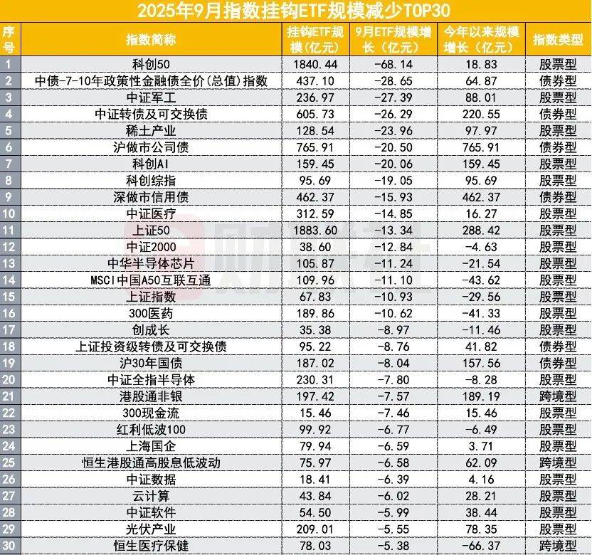 指数挂钩ETF规模减少前30中,科创50指数表现最为明显,合计净流出68.14亿元,7-10年政金债挂钩ETF净流出28.65亿元。此外,军工指数、可转债指数、稀土产业指数、沪做市公司债、科创AI等挂钩ETF净流出超20亿元。