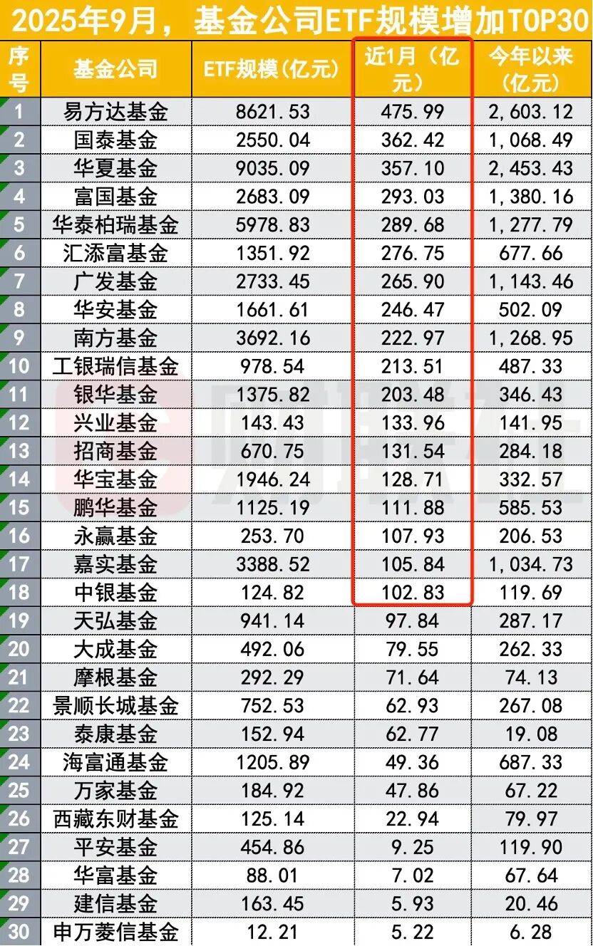 国泰基金在9月以362.42亿元的增长排名第二,证券ETF、科创债ETF等优势产品规模贡献了多数增量。华夏基金则以357.1亿元增长排名第三。富国基金、华泰柏瑞基金9月单月增幅也接近300亿元。