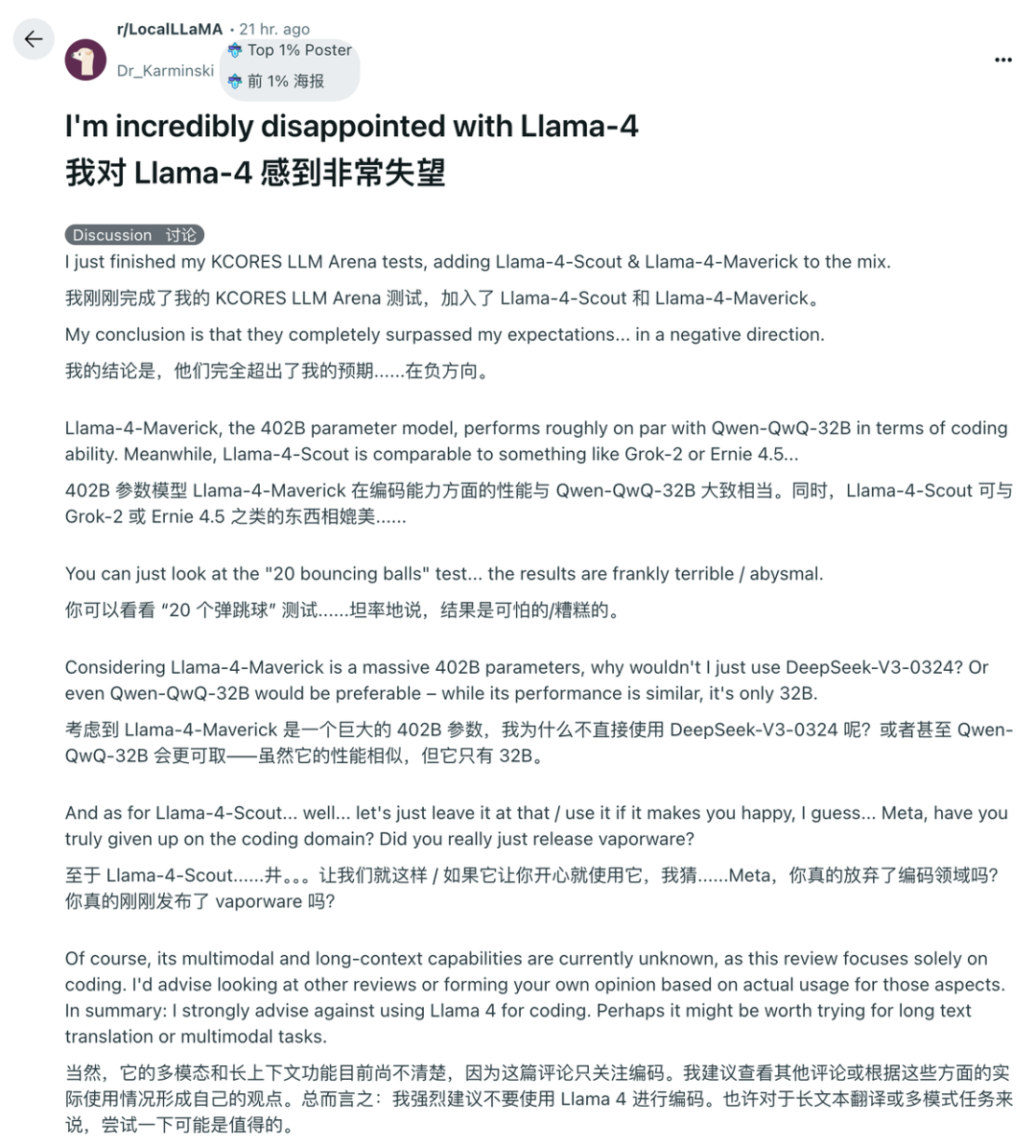 但从DeepSeek开源以来,LLama开源第一的位置坐得不稳,甚至后来还爆出了作假丑闻:
