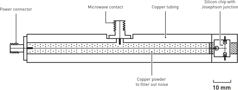 当一种材料成为超导体时,电子会结合成对,形成库珀对,并产生无电阻的电流。图示中的空隙标示的就是约瑟夫森结。