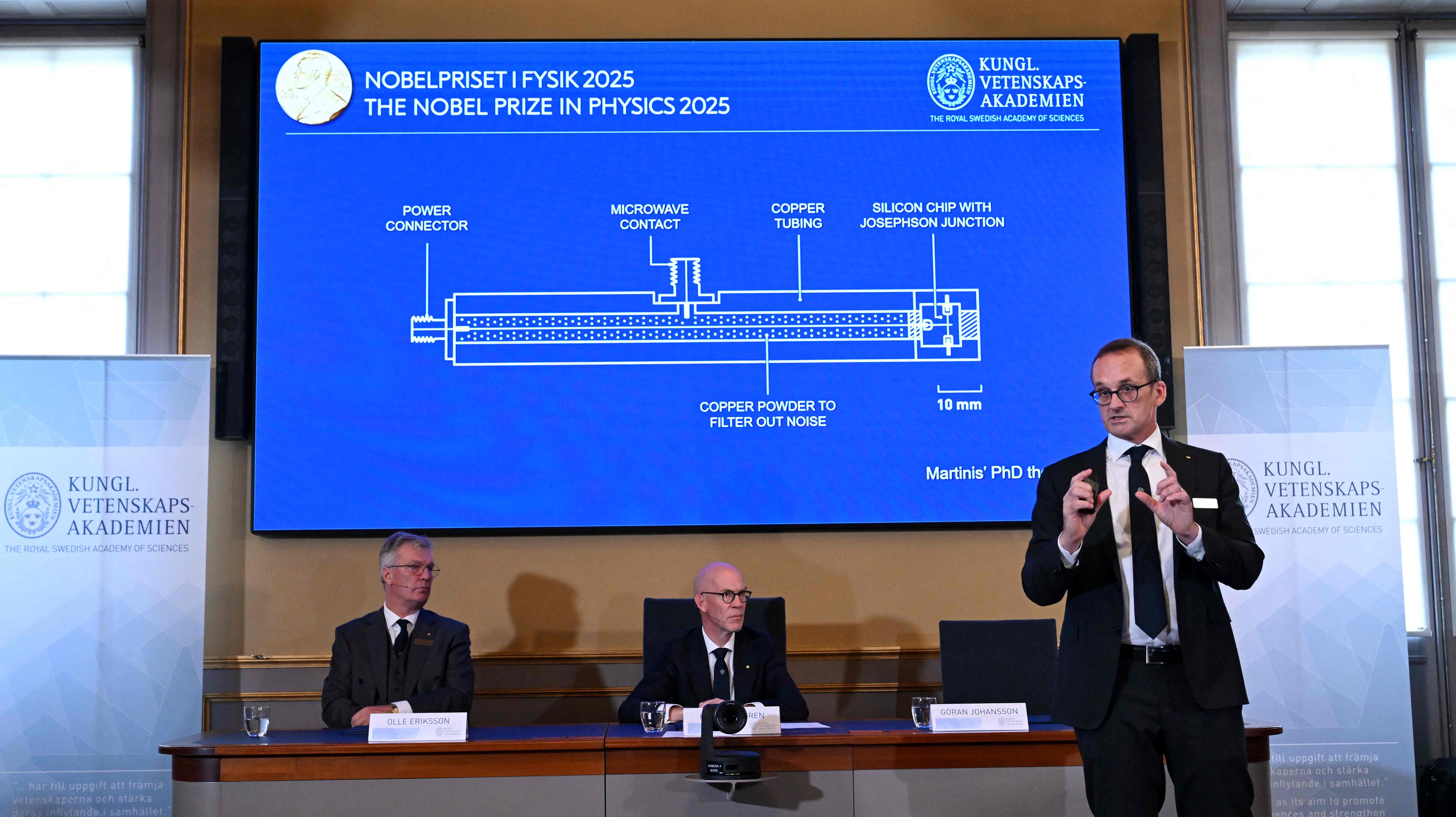 今年的诺贝尔物理学奖表彰了一系列实验,这些实验证明了量子隧穿现象可以在包含大量粒子的宏观尺度上被观测到。1984年至1985年间,约翰·克拉克(John Clarke)、米歇尔·德沃雷(Michel Devoret)和约翰·马丁尼斯(John Martinis)在加州大学伯克利分校开展了一系列实验。他们构建了一个由两个超导体组成的电路,这些超导体能够无电阻地传导电流,并通过完全不导电的薄层材料将两者隔开。实验中,他们成功控制并研究了一种现象:超导体中的所有带电粒子会像单个粒子一样协同行为,填满整个电路。