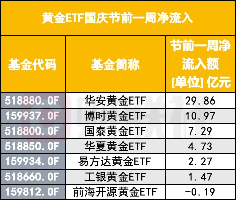 具体来看,节前一周(9月23日至30日),黄金ETF产品普遍录得正向资金流入。华安黄金ETF净流入额达到29.96亿元,博时黄金ETF超过10亿元、国泰黄金ETF、华夏黄金ETF、易方达黄金ETF、工银黄金ETF等产品净流入均超亿元,显示大量投资者在节前就已开始进行黄金仓位的调仓配置。