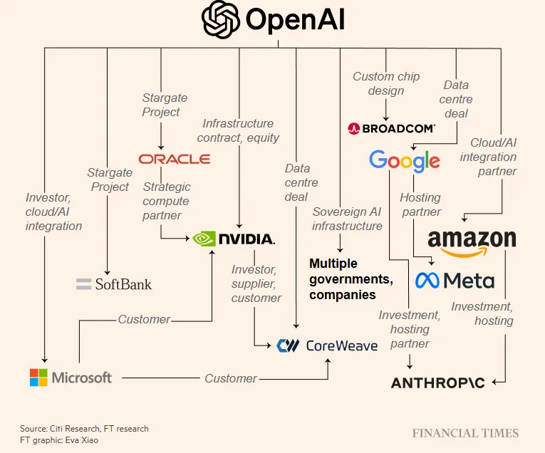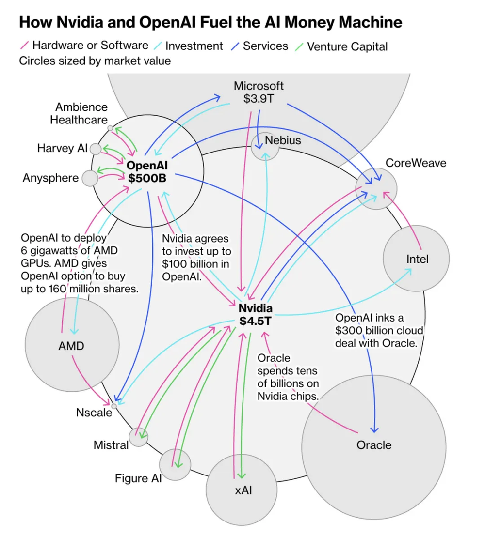 此前从未有过如此巨额的资金被如此迅速地投入到一项尽管潜力巨大,但其盈利能力在很大程度上仍未经证实的技术上。而这些投资通常可以追溯到两家领先的公司:英伟达和OpenAI。近期,两大巨头之间发生的一系列交易和合作加剧了人们的担忧:日益复杂且相互关联的商业交易网络正在人为地支撑着价值数万亿美元的人工智能热潮。几乎每个经济领域都面临风险,人工智能基础设施的炒作和建设波及了各个市场,从债务、股票到房地产和能源。