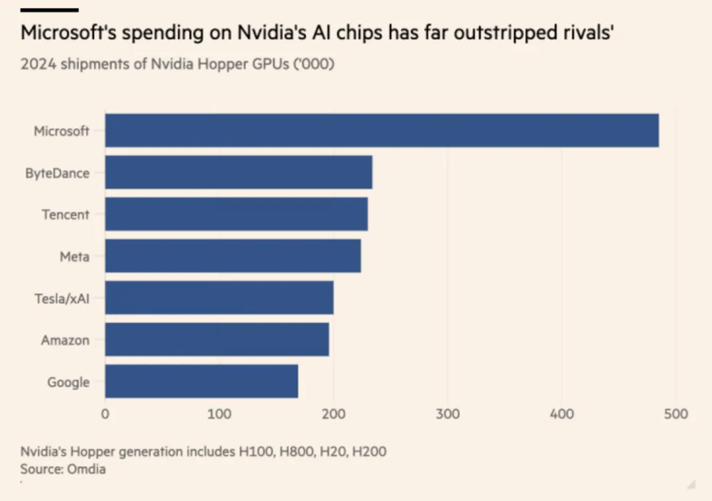 另一家巨头微软也是GPU的大买家。科技咨询公司Omdia的分析师估计,微软在去年购买了48.5万块英伟达的“Hopper”芯片。这使得微软远远领先于英伟达的第二大美国客户Meta(购买了22.4万块Hopper芯片),以及其云计算竞争对手亚马逊和谷歌。