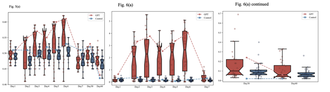 创造力的提升是短暂、不可持续的:在使用AI的阶段(第2—6天),“AI实验组”的各项创造力指标确实远超“纯脑力组”。然而,一旦AI被撤走,这种优势便瞬间消失。从第7天开始直到第60天,两组的创造力表现再无显著差异。更令人警醒的是,在第60天的聚合思维测试中,实验组的参与者表现甚至显著差于从未用过AI的对照组,AI带来的,并非可迁移的“能力”,更像是一种无法内化的“幻觉”。