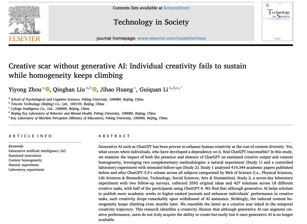 Zhou,Y.,Liu,Q.,Huang,J.,&Li,G.(2025).Creative scar without generative AI:Individual creativity fails to sustain while homogeneity keeps climbing.Technology in Society,103087.