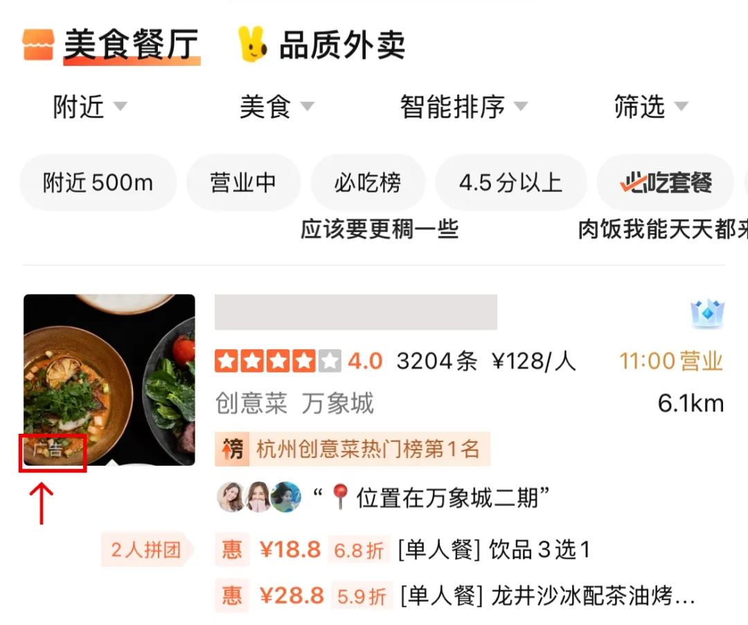 有预算的商家还会考虑推出“团购”套餐,虽然团购套餐会进一步压缩餐厅的利润,平台也会在每一单团购中抽走大约在3%-5%的返点(佣金),但团购套餐的销量与店铺的人气、推荐位息息相关。