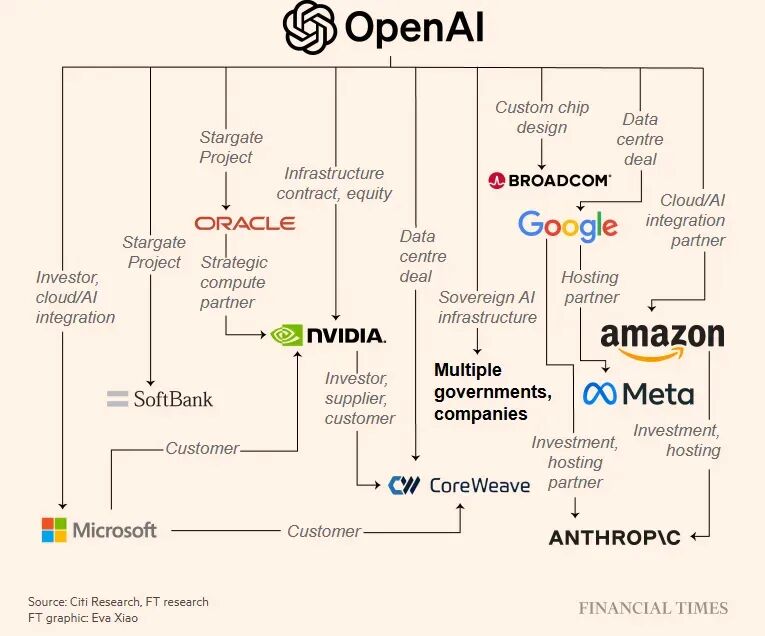 英伟达投1000亿美元给OpenAI建AI基础设施,OpenAI再用这钱去买英伟达的芯片;xAI从英伟达拿钱,再去买英伟达的处理器;OpenAI几年内从AMD买60亿瓦(6 gigawatts)芯片,再用极低作价买AMD股票。