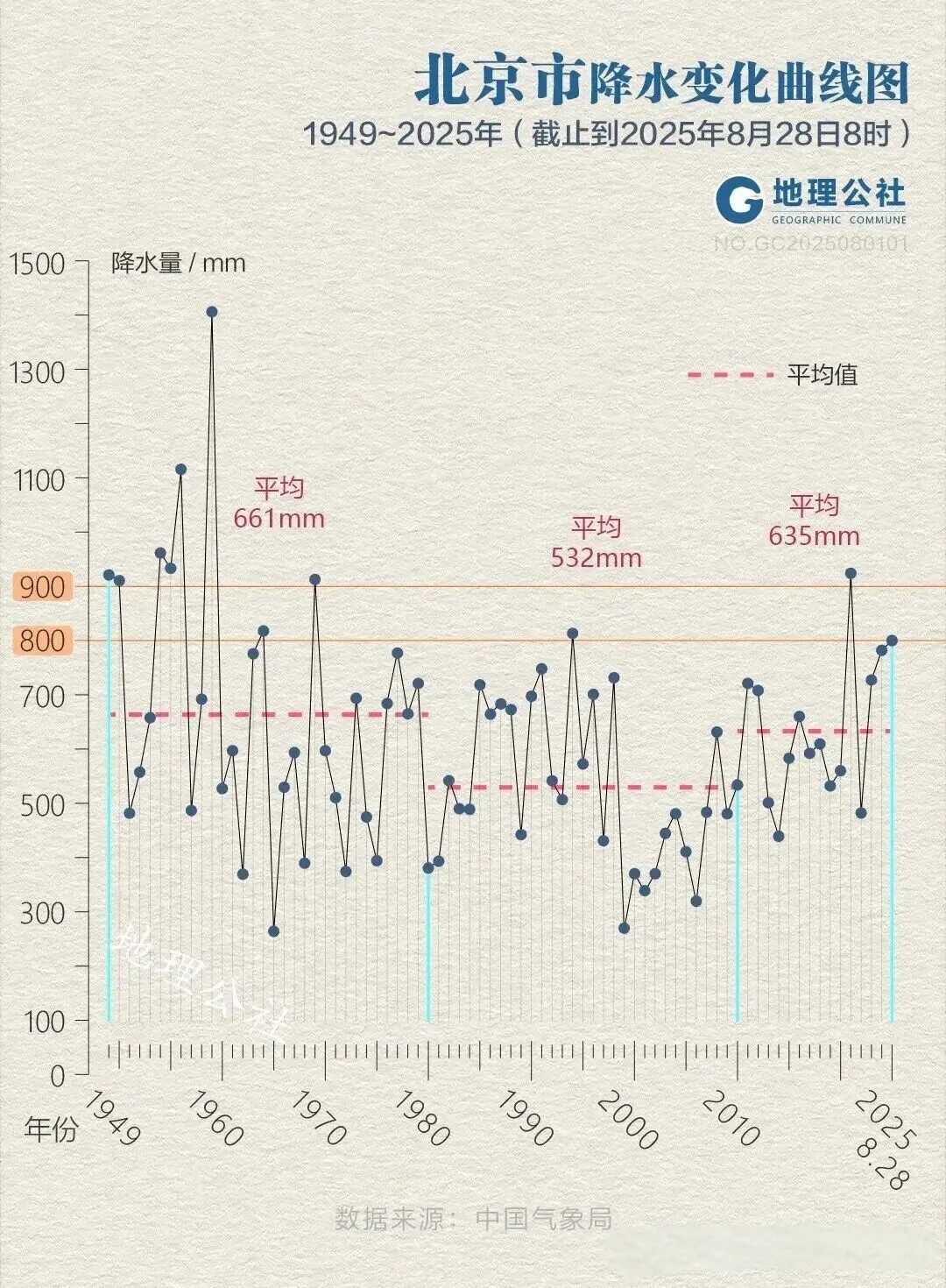 这种变化最直接的表现是华北雨季的显著延长,例如2022年雨季长达53天,较常年平均值大幅增加。与此同时,北方地区的降水强度也明显增强,北京等地的年降水量更是几乎每年都会创下新的纪录。