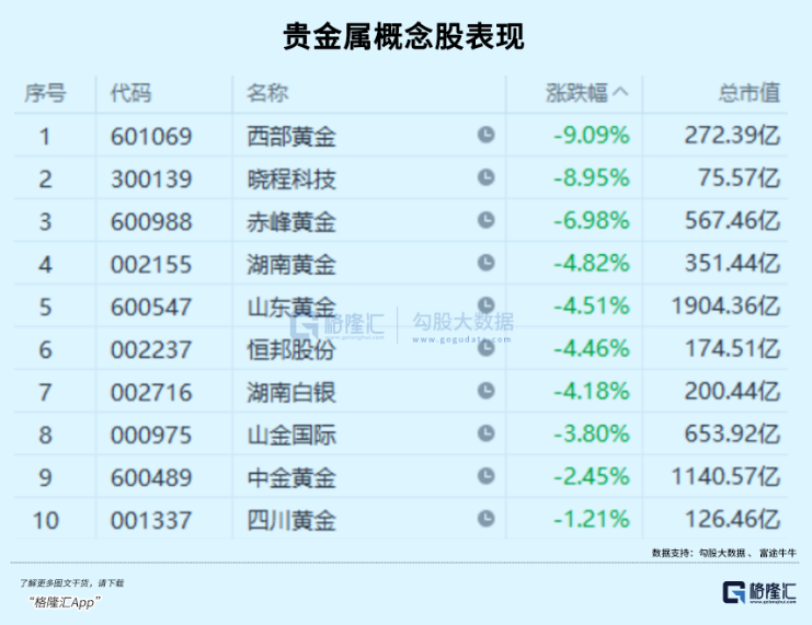 集体回调还有贵金属板块,黄金、白银双双大跌。西部黄金跌9.09%,晓程科技跌8.95%,华锡有色、赤峰黄金跌超6%,盛达资源、湖南黄金、湖南白银、山东黄金跌幅居前。