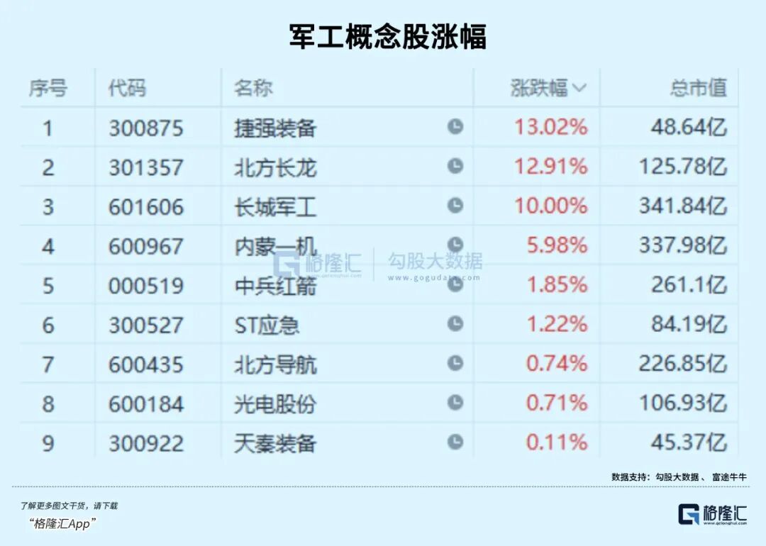 但另一边,军工、公用事业、传统消费、水泥建材等行业逆势明显上涨,其中军工板块更是整体大涨近5%,并贡献了多数的涨停板个股,成为今天表现最强势的领涨板块。