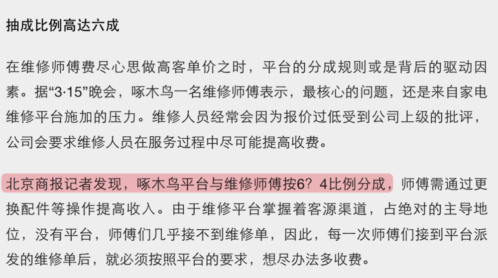 315 曝光的啄木鸟宰客,有一部分原因是平台抽成高达 60%,师傅老老实实干活可能养不活自己,但单干又接不到订单,所以他们只能想办法去多收费。