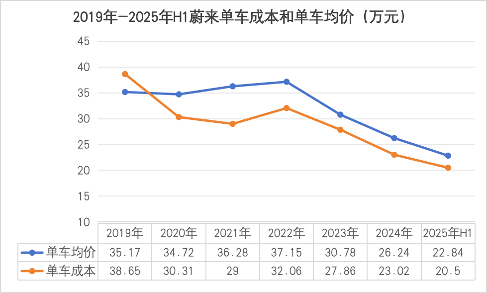 2021~2022年,全球锂、钴、镍等原材料价格暴涨,碳酸锂价格从2020年的4.56万元/吨飙升至2022年的48.21万元/吨,直接推高电池包成本,导致蔚来单车成本从2020年的30.31万元上升至2022年的32.06万元,上升约1.75万元。2023年以后,碳酸锂价格虽一路暴跌,但蔚来单车成本的下降幅度不及单车均价的降幅。2022年至2025年H1,蔚来单车成本下降约11.56万元,单车均价下降约14.31万元。