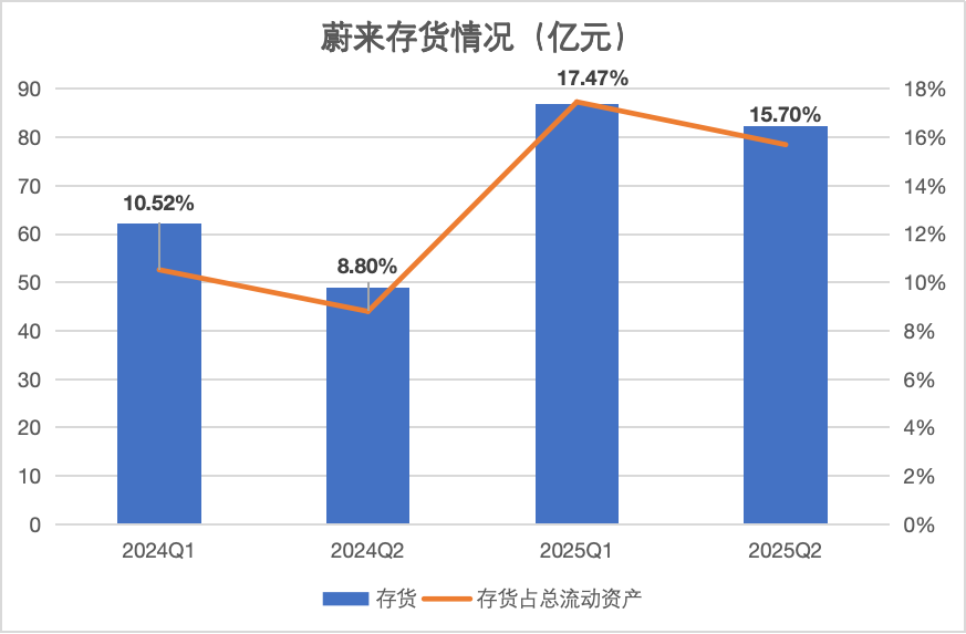 财报显示,蔚来今年上半年存货169.39亿元,同比大幅增长52.7%,其中二季度存货82.43亿元,同比增长68.7%。