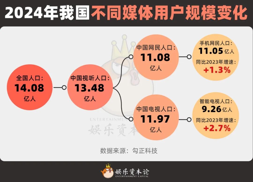 首先,中国电视人口数量仍居整体视听人口首位。2024年全国14.08亿人口,其中电视人口11.97亿,大于网民人口11.08亿。