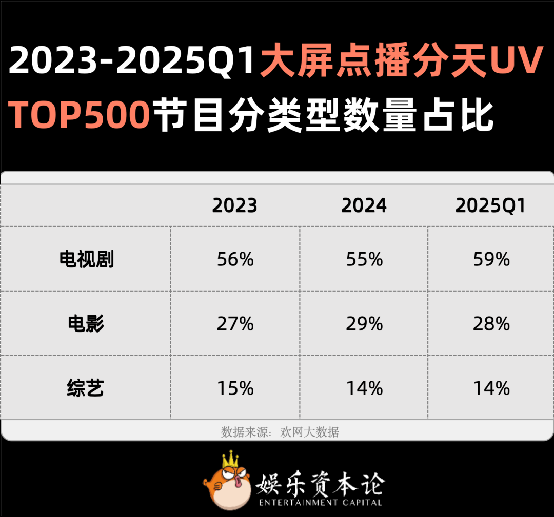2024年,欢网大数据统计大屏点播分天UV TOP500节目分类型数量,以及勾正科技监测智能电视不同节目类型内容日活规模,电视剧都排名第一。