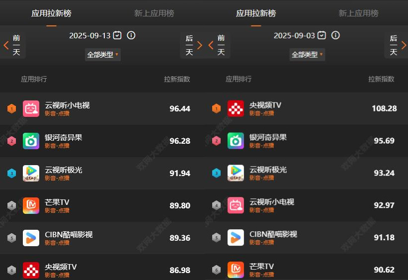 其他长视频用户则会跟随爆款内容而在游走,例如在《生万物》热播时,大屏长剧观众就会聚拢在爱奇艺的银河奇异果应用中,其他长剧的大屏应用数据就会下降。在“九三阅兵”的特殊时间段,央视频TV则被带上日榜榜首。