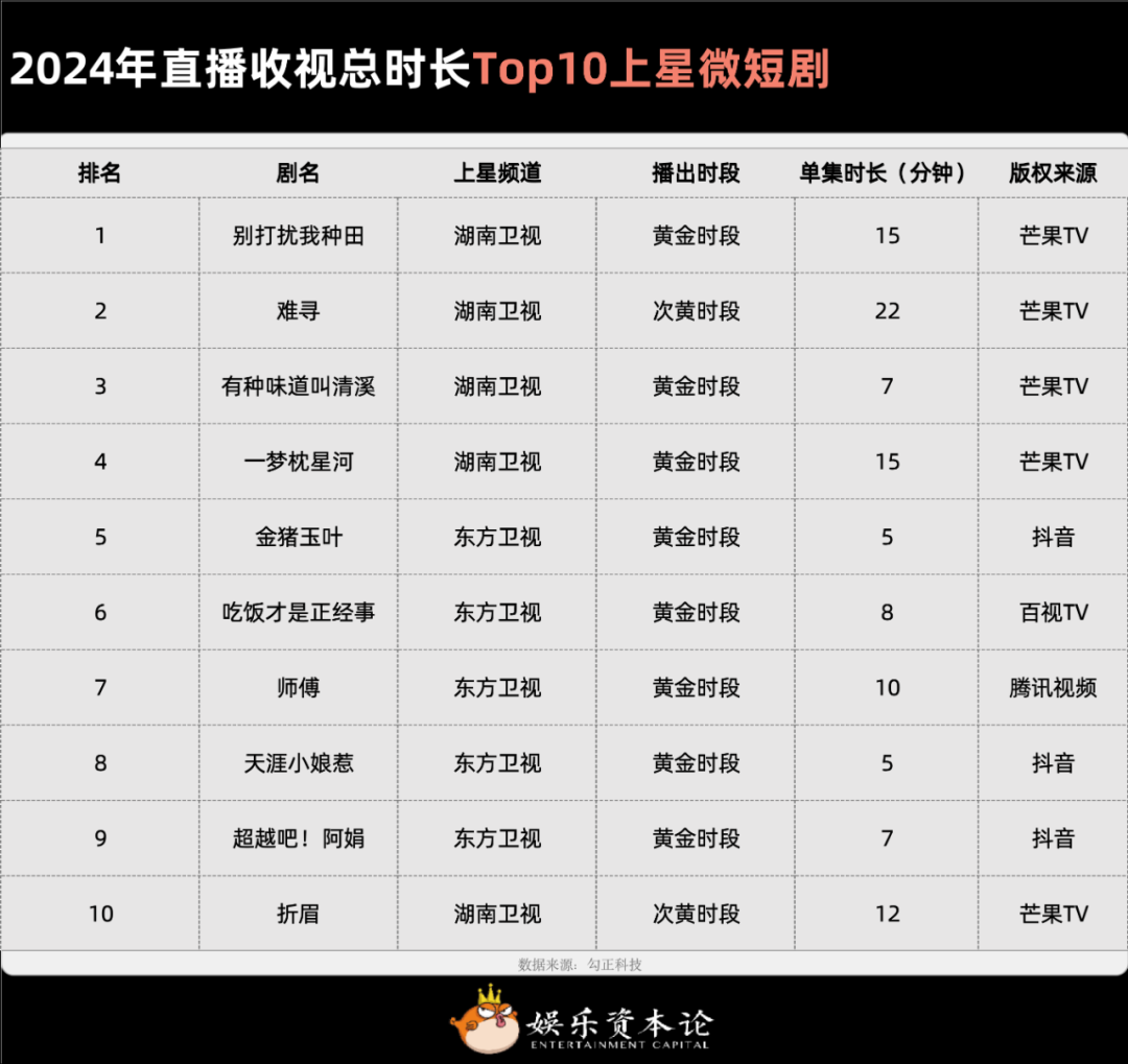 在大屏“适短化”与响应广电号召的平衡点上,从央视到一线卫视纷纷开设微短剧直播节目档,勾正科技给出的2024年直播收视总时长Top10上星微短剧中,湖南卫视与东方卫视表现出众;版权来源中,芒果TV的中剧(横屏微短剧)占据半壁江山。