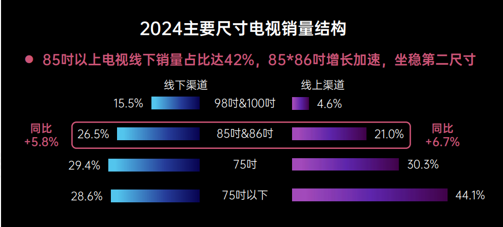 2024年电视销量的主要尺寸以85吋&86吋增长最多,未来家庭观看电影的场景会近似于家庭影院感受,很多中腰部票房的影片,可以在大屏端寻求更多发行收益。