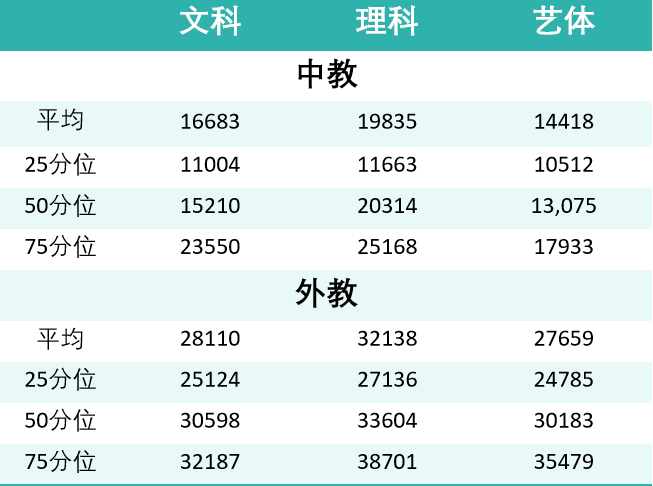 外教:理科教师依旧领跑,文科和艺体教师紧随其后,且文科、艺体外教薪资是中教的2倍多。