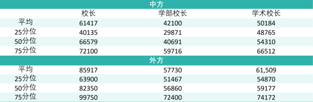 校级管理岗位方面,薪资从高到低依次是校长、学术校长、学部校长,与上一学年相比, 均有不同程度增长。中方校长平均 61417 元,外方校长85917元,为薪资天花板;其中中方校长增幅 2.7%,外方校长增幅7.5%,涨幅最大;