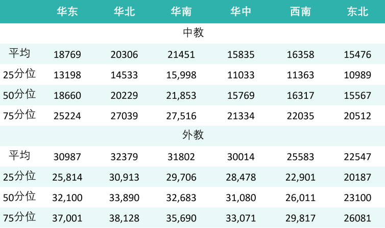 大区差异:中教以华南(21451 元)最高,东北(15476 元)最低,两地相差 39%;外教则是华北(32379 元)最高,东北(22547 元)最低,差距 43%;