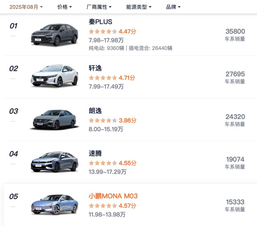 汽车之家的统计显示,今年8月,比亚迪秦全系销量3.58万辆,超过了日产轩逸、大众朗逸等经典畅销车型。降价不仅有助于比亚迪清理库存、实现产品结构调整,也为整个行业的价格战进一步加码。