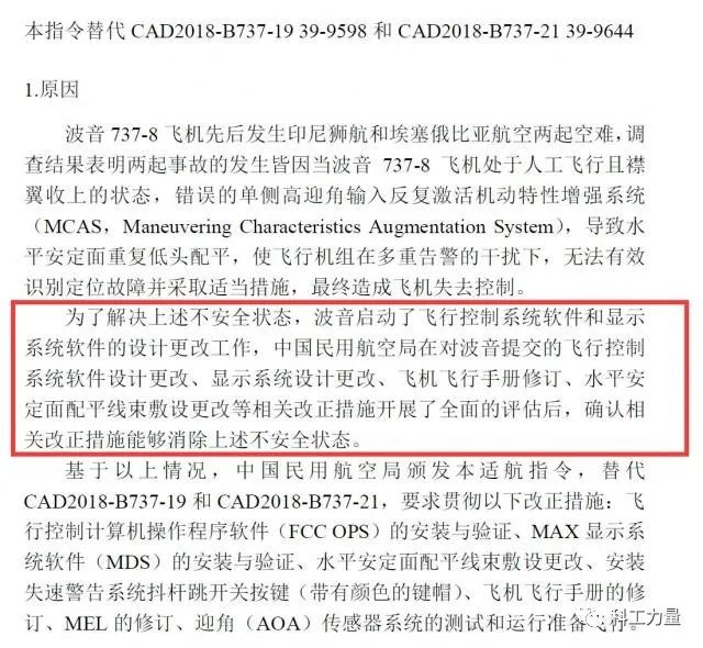 在适航指令中,中国民航局明确指出了波音737MAX的MCAS系统所存在的重大隐患以及对波音后续整改措施的认可,并提出完成相应的改进措施后就视为消除了MCAS所带来的不安全状态,也即满足了适航标准。