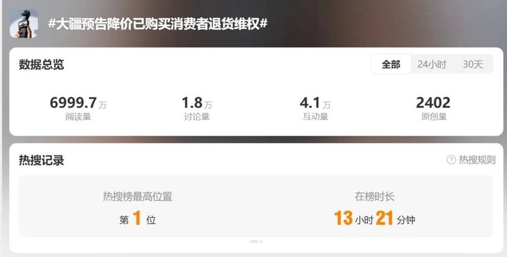 近日,“大疆预告降价,已购买消费者退货维权”等话题引发大量关注,登上微博热搜榜单第一。