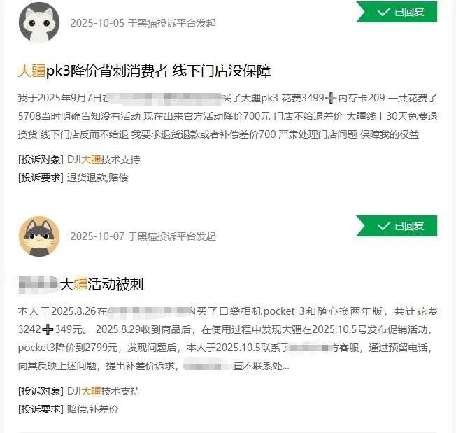 有用户晒出聊天记录显示,自己购买的Pocket 3激活后仍成功申请退货退款;也有用户表示,有经销商以“已激活”为由拒绝退差,只能通过投诉维权。
