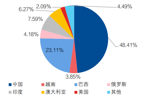 USGS估算,2024年,全球稀土资源储量约9088万吨;其中中国有4400万吨,占48.4%,巴西、印度、澳大利亚、俄罗斯、越南和美国六国合计再占约47%,前七国(CR7)累计占据95.5%。