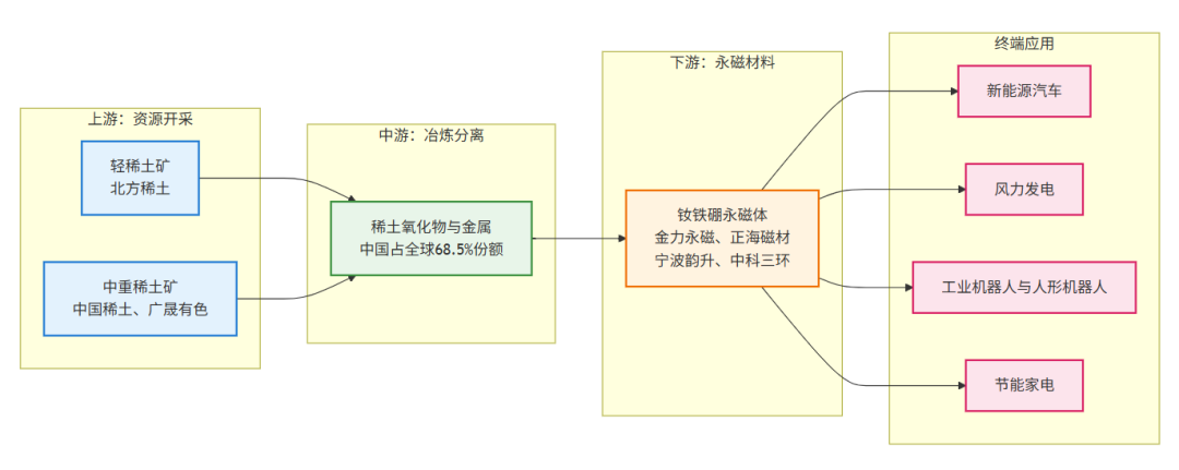 中国是全球唯一拥有完整稀土产业链的国家,构建了覆盖“上游开采-中游冶炼-下游应用”的闭环体系 。