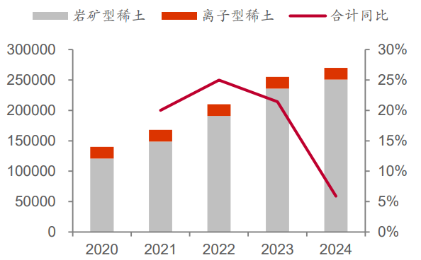 2024年,国内稀土开采和冶炼分离指标增速已显著放缓,分别为5.88%和4.16%,远低于2017~2024年超14%的年均复合增长率。