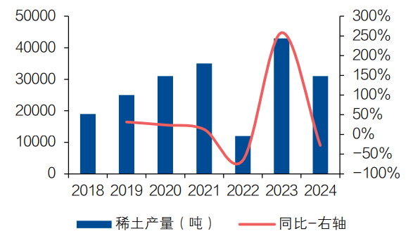 受此影响,2024年,缅甸稀土产量约3.1万吨,同比下滑27.91%。