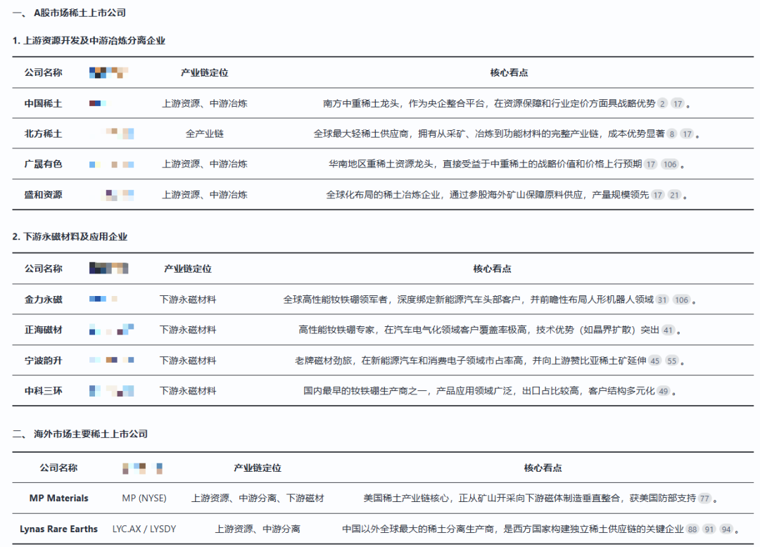 这里我整理了稀土产业链上游资源开采、中游冶炼、下游永磁材料生产的头部公司清单,由AlphaEngine FinGPT梳理。