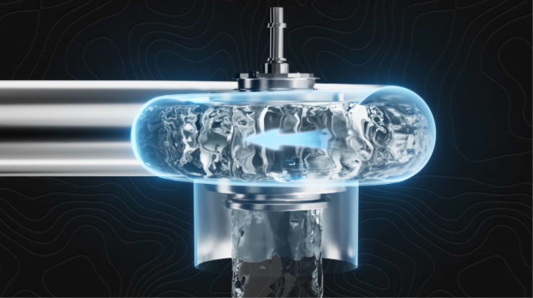 水流会从水轮机四周水平方向向中心流入转轮,然后转为向下方向出口,水流进入转轮时,会推动转轮旋转,同时在向下通过叶片时,还会再推动转轮一次。