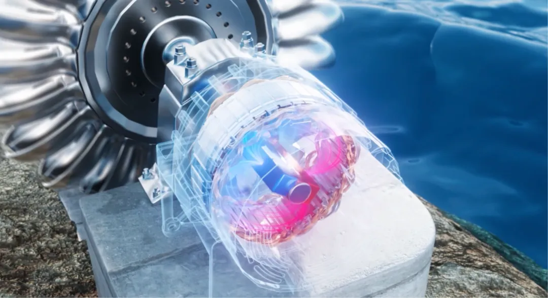 水轮机高速旋转,带动发电机的转子转动。转子上的磁场随之旋转,并不断切割外围的定子线圈,就能产生电流。这就是水力发电的基本原理。