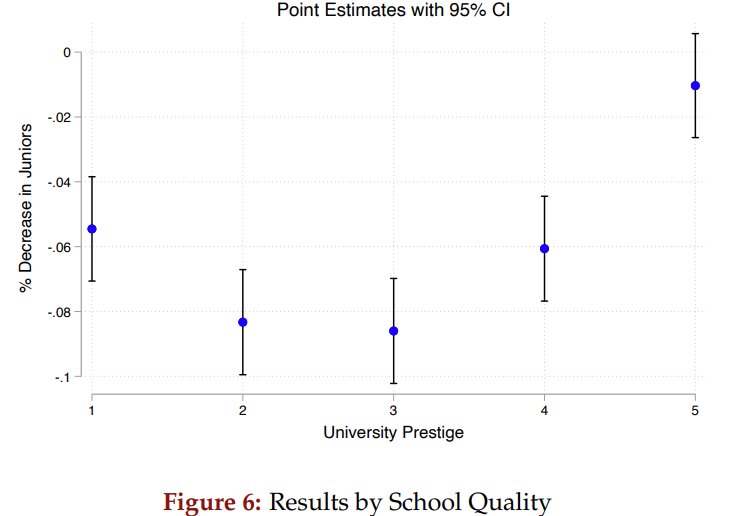 他们发现了一个有趣的U型现象:受冲击最显著的,是来自Tier 2和Tier 3中间梯队院校的毕业生。来自Tier 1顶尖名校和排名靠后院校的毕业生,受到的影响反而较小。Tier 5院校毕业生的就业下降幅度甚至是最小的,且在统计上不显著。