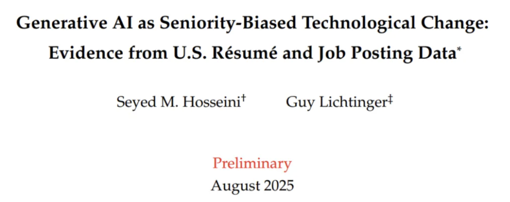 哈佛大学的两位学者,Seyed M.Hosseini与Guy Lichtinger,在一篇名为《生成式AI作为资历偏向型技术变革》的论文中,为我们提供了确凿的证据。