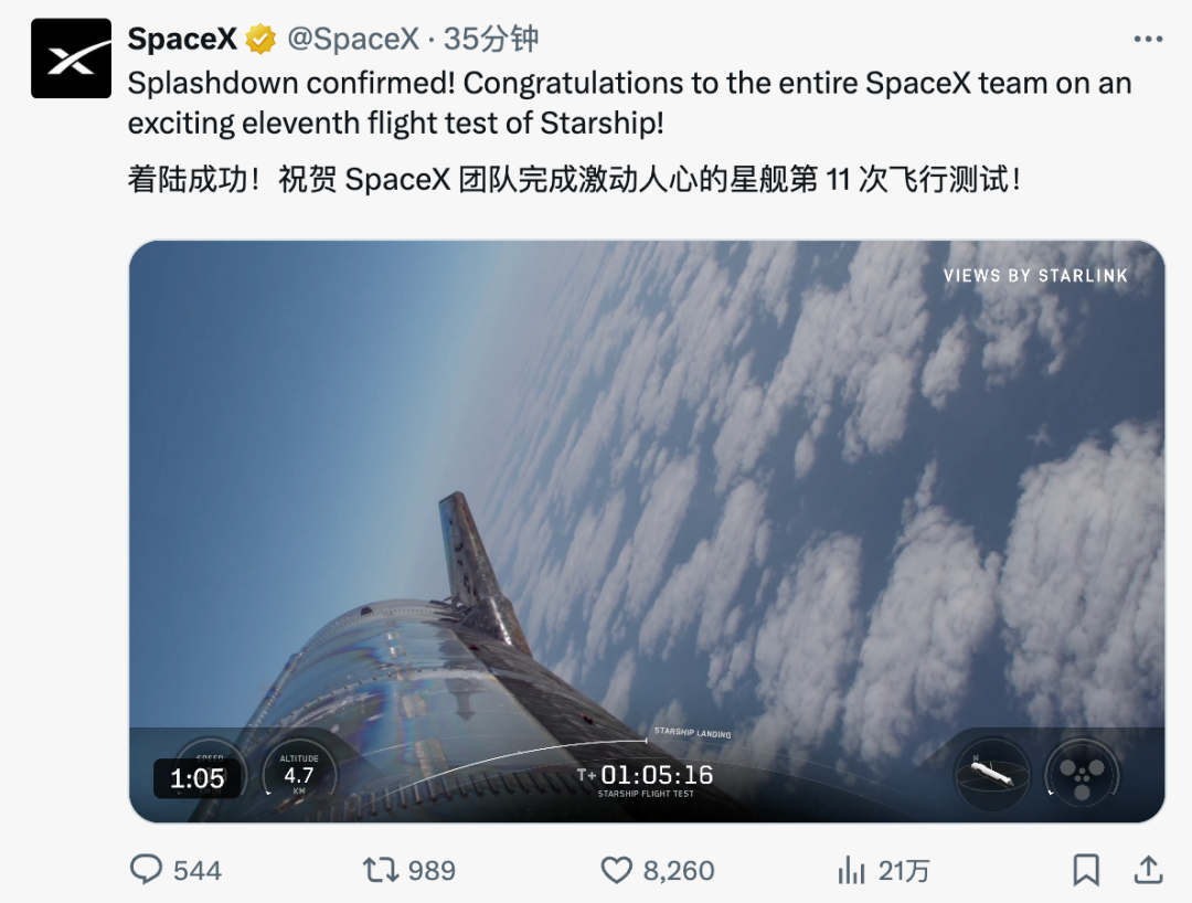 就在刚刚,星舰第 11 次飞行任务圆满完成——15 号助推器再次征战,8 颗星链模拟器完美部署,隔热瓦被故意移除接受极限测试,飞船在印度洋成功完成溅落。