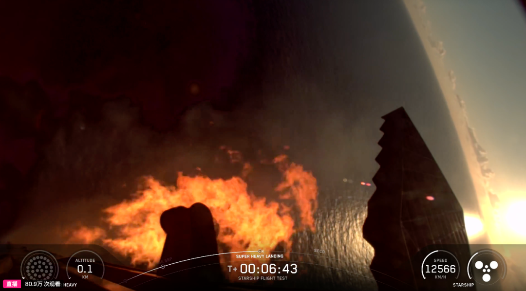 而“超级重型”助推器开始执行返回推进,朝预定溅落点飞行,准备进行着陆点火实验。