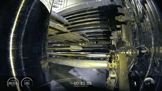 飞船侧面的大型舱板——被称为“有效载荷门”的舱口打开后,开始释放模拟卫星。与其他火箭通常通过鼻锥释放卫星不同,星舰采用侧边舱门设计,必须打开这道侧门才能将卫星释放到太空。