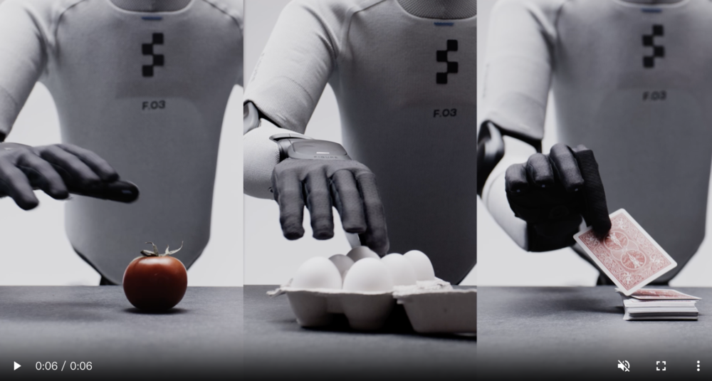 不仅如此,机械手的触觉也得到了改良。Figure 03 有着更加柔软灵敏的指尖,与物品的接触面积相应扩大,抓取物品变得更加稳定和灵巧。据官方测试,每个指尖传感器都能检测到低至3克的压力,其灵敏度足以感知回形针在手指上的重量。现在,不论是易碎、不规则,抑或是移动着的物体,新一代机器人都能轻松“拿捏”。