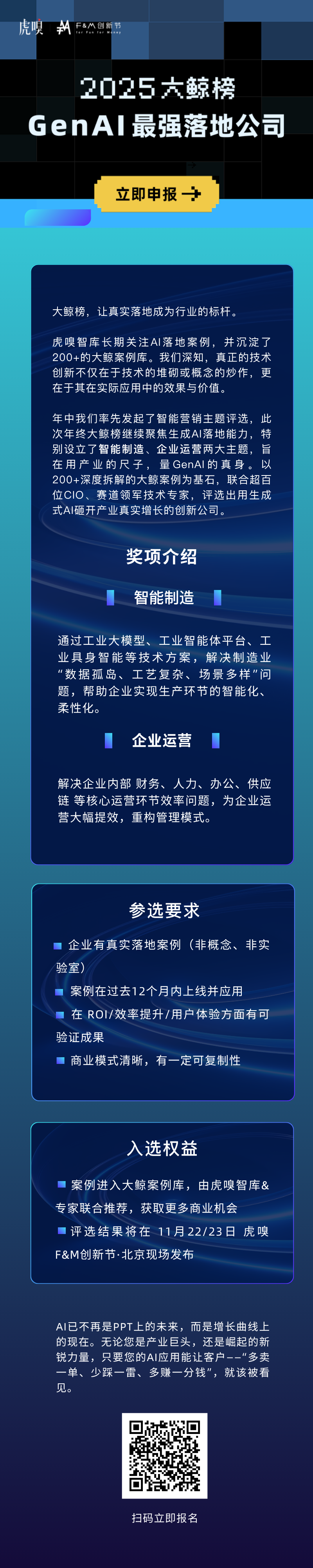 在2025年这个关键节点,我们再次发起了「2025大鲸榜·GenAI最强落地公司」评选,希望继续通过榜单与案例的形式,记录AI落地的“真价值”——从智能营销到工业制造,从企业运营到办公协同,让每一个“落地的故事”都能被看见。