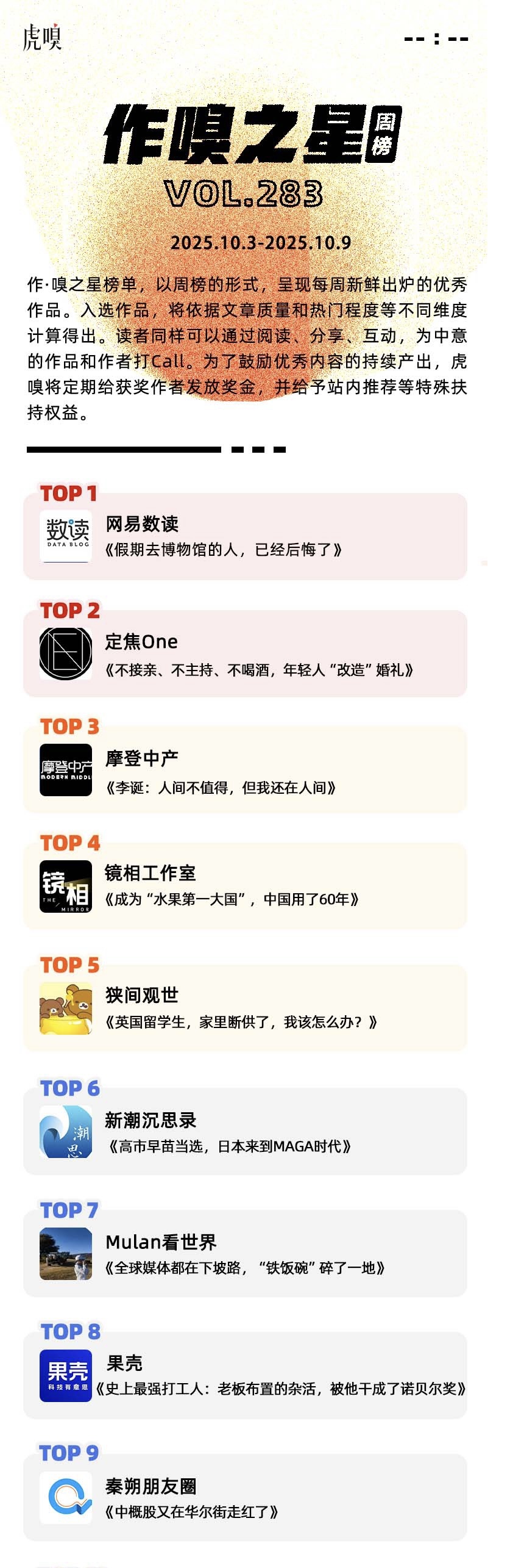作·嗅之星榜单,以周榜的形式,呈现每周新鲜出炉的优秀作品。2025年10月3日~2025年10月9日,虎嗅第283期,作·嗅之星的获奖文章分别是:
